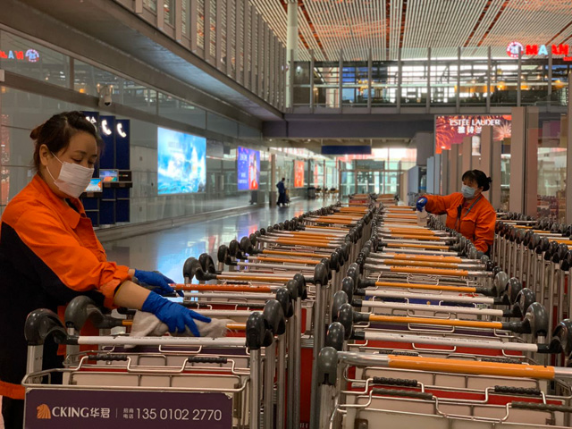 旅客進(jìn)入首都機(jī)場航站樓,從值機(jī)到登機(jī),會接觸到不同種類的設(shè)備設(shè)施。為了防止病毒接觸傳播,首都機(jī)場安排了保潔人員對所有旅客設(shè)施進(jìn)行消毒,消毒的設(shè)施包括:電梯按鈕、扶手、手推車、旅客座椅、安檢機(jī)、垃圾桶、值機(jī)柜臺、行李轉(zhuǎn)盤、衛(wèi)生間等,為旅客安全出行提供全方位的健康保障。除了對旅客活動區(qū)域進(jìn)行消毒外,首都機(jī)場在航站樓內(nèi)還對員工工作場所進(jìn)行消毒,保證員工工作環(huán)境的安全。