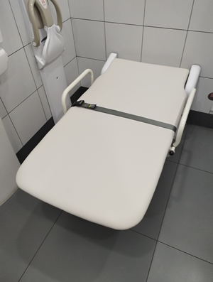 在2號航站樓出發(fā)層北側(cè)無障礙衛(wèi)生間內(nèi),設(shè)置了無障礙護理床。輪椅旅客、老年旅客、病人及護理人員可以使用護理床,更換整潔的衣物、紙尿褲、導尿等。